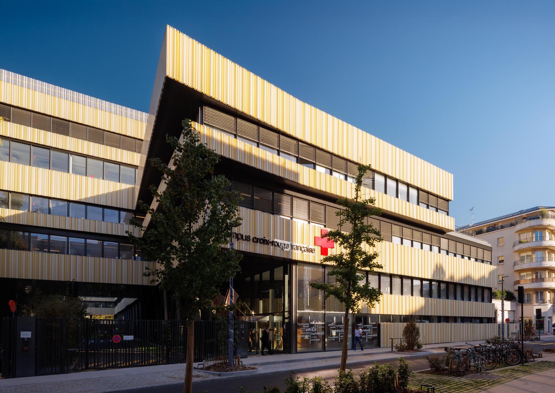 27. Croix-Rouge française17h. Au bout de la promenade de l’Aqueduc de la Vanne, après avoir scruté les détails travaillés des entrées de la résidence de la Cité, nous descendons la rue Barbès en direction du centre-ville et nous faisons un crochet par le début de la rue de la Vanne pour apprécier l’un des nombreux sièges sociaux d’entreprises ou d’associations installés à Montrouge. Nous vous parlons bien sûr du siège social de la Croix-Rouge française [27], conçu par le cabinet d’architectes Brenac & Gonzalez et livré en 2018 au 21-23 rue de la Vanne, sur l’ancienne emprise de l’usine Bobin. L’édifice reprend une figure en « peigne » avec un bâtiment principal complété par cinq volumes perpendiculaires plus bas, dont les creux sont occupés par des terrasses, jardins et patios arborés. Ses façades offrent un savant jeu de formes, de couleurs et de profondeurs grâce à des fenêtres bandeaux et à un habillage en tubes d’aluminium thermolaqués dans des teintes beige et or. Le bâtiment arbore de multiples nuances chromatiques au fil de la journée et des variations de la lumière. Et ce n’est pas le seul siège social hébergé aujourd’hui à Montrouge.