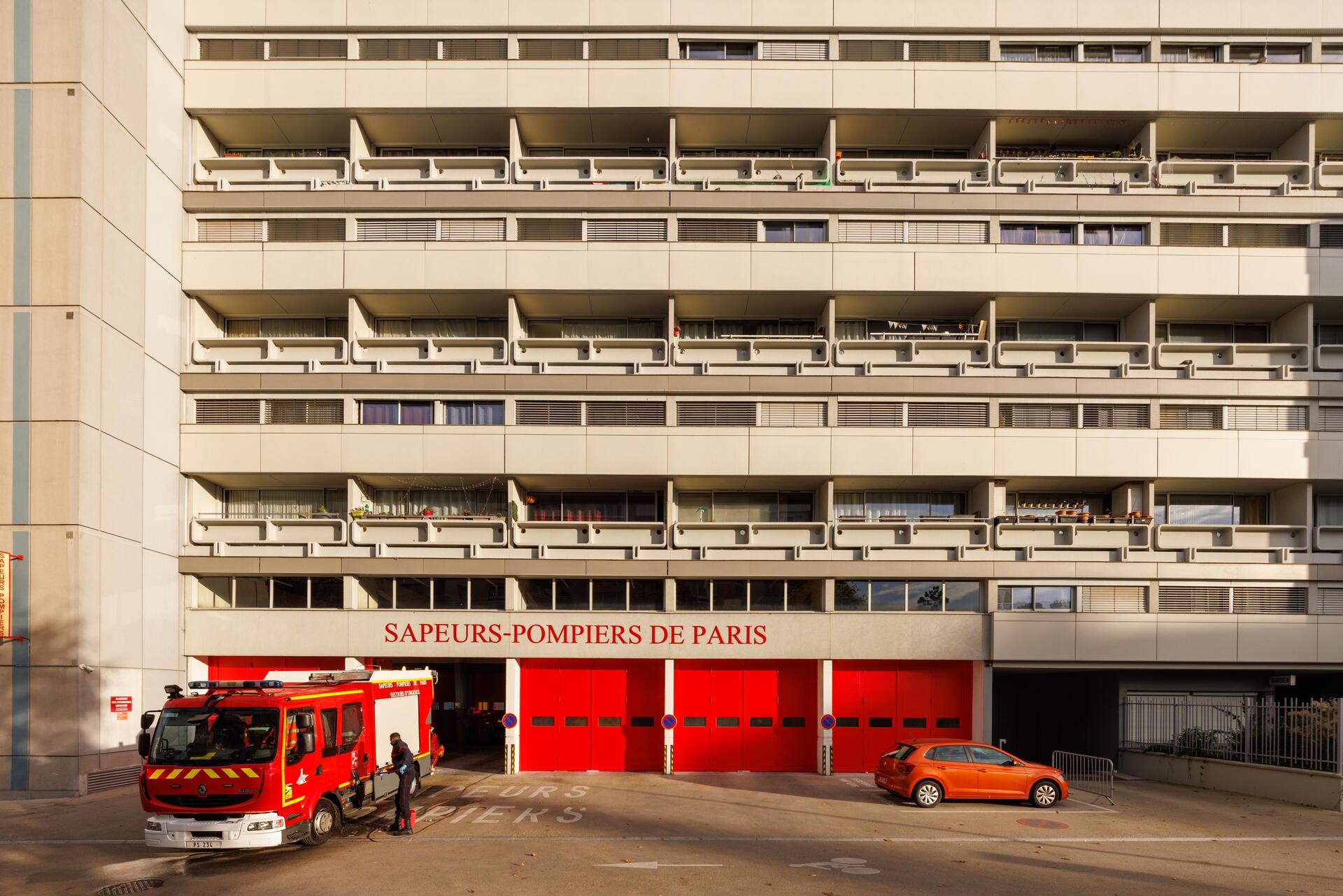 20. Caserne de pompiers16h20. Nous traversons l’avenue Aristide Briand pour gagner la petite rue Thalheimer puis déboucher au 53 rue de la Vanne, devant la caserne de pompiers [20] de Montrouge. Réalisé entre 1960 et 1969, ce programme comprend, en plus de la caserne, la construction d’un ensemble de 38 logements sociaux (pour un tiers, destinés aux pompiers), d’un garage et de locaux commerciaux en rez-de-chaussée. Il est l’œuvre de Jean Renaudie, l’un des quatre architectes modernistes qui composaient l’Atelier de Montrouge de 1958 à 1981, aux côtés de Pierre Riboulet, Gérard Thurnauer et Jean-Louis Véret. Cette association, installée à l’époque au 32 rue d’Estienne d’Orves, prônait une architecture soucieuse des réalités humaines, sociales et environnementales. Parmi ses principales réalisations, citons la tour de logements EDF à Ivry-sur-Seine (1967), la crèche Hippolyte Mulin [21] à Montrouge (1964) ou encore le centre de loisirs de Villelouvette situé dans l’Essonne (1968). « Ici, nous avons trois corps de bâtiments reliés par deux "rotules" qui abritent escaliers et ascenseurs. Les façades sont très qualitatives et détaillées. Les garde-corps sont des modules préfabriqués, considérés comme un projet à part entière et dessinés de manière sculpturale », détaille Alix Lazian. À l’intérieur, les appartements de trois ou quatre pièces en duplex répondent parfaitement aux objectifs fixés par les architectes de l’Atelier de Montrouge : créer un habitat collectif, accessible au plus grand nombre, minimaliste dans la forme et les matériaux, et surtout… fonctionnel ! En jetant un œil sur la façade arrière des bâtiments, donnant sur la promenade de l’aqueduc de la Vanne, nous découvrons la tour d’exercice de la caserne, traitée elle-aussi comme une sculpture.
