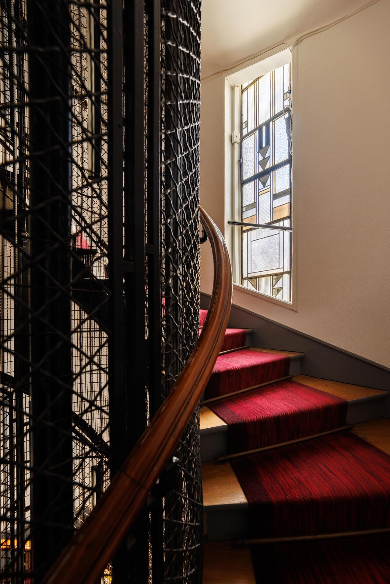 8. Ateliers d'artistes15h. Nous rejoignons la place Jules Ferry, connue pour avoir accueilli dès 1930 le plus grand ensemble d’ateliers d’artistes [8] de la région parisienne, composé de quatre immeubles, des numéros 40 au 46. Ici, de nombreux artistes vécurent, parmi lesquels le photographe Robert Doisneau, les peintres Fernand Léger, André Fougeron, Charles Bouleau, Georges Barat-Levraux et Takayoshi Sakabe, le sculpteur Étienne Béothy, le typographe Adrian Frutiger, la graveuse Véra Braun ou encore les architectes Jean-Louis Véret et Georges Johannet. Œuvre des architectes Eugène Gonnot et Georges Albenque, célèbres pour leurs cités-jardins réalisées en Île-de-France, cet ensemble de logements collectifs comporte 81 appartements composés chacun d’un atelier de grande hauteur (4,20 mètres sous plafond) avec une verrière orientée au nord, idéale pour que les artistes puissent profiter d’une douce lumière. Cet ensemble a été construit pour y loger les artistes alors que Montparnasse, haut-lieu des ateliers d’artistes dans la capitale, ne pouvait plus accueillir de nouveaux ateliers-appartements. Face au 46 place Jules Ferry, nous contemplons la façade Art déco. « Sous certaines fenêtres et au cinquième étage, la façade s'anime d'un jeu de briques aux formes arrondies et disposées en quinconce. L'important linéaire de façade est rythmé par la verrière de l'escalier et des oriels (fenêtres en encorbellement) triangulaires. Le rez-de-chaussée est traité en béton armé avec des motifs verticaux s'alignant sur les ouvertures », souligne Alix Lazian. Devant l’immeuble, nous croisons alors Francine Deroudille, l’une des deux filles de Robert Doisneau, qui nous fait entrer dans la cage d'escalier. Après avoir monté quelques marches de l’escalier en chêne, nous admirons de plus près les vitraux à motifs ornementaux géométriques, conçus et fabriqués par le maître-verrier Louis Barillet.