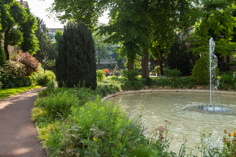 Côté cour : C’est tout d’abord le clapotis d’un jet d’eau au centre du bassin à filtration naturelle qui accroche l’oreille du visiteur. Puis, l’oeil est ravi à la vue de la pièce d’eau. Les « nounous » surveillent les enfants qui dévalent sur l’aire de jeu, les iris pointent le bout de leurs tiges. Un homme, sur son banc, semble contempler un beau bouleau... Le spot parfait pour contempler toute cette beauté, un régal pour les yeux car la floraison y est permanente.