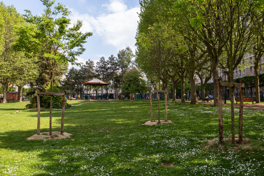 Côté jardin : Nous sommes dans un autre poumon de la ville de près de 8 200 m². L’endroit est aéré, encadré par des pins et d’immenses platanes bicentenaires en double rangée, enrichi d’une grande pelouse, de prairies fleuries, d’un kiosque à musique, d’un terrain de basket, de deux aires de loisirs pour enfants avec toboggan, balançoires et autres jeux. En son centre s’élève un sequoia planté par le Conseil municipal des enfants.