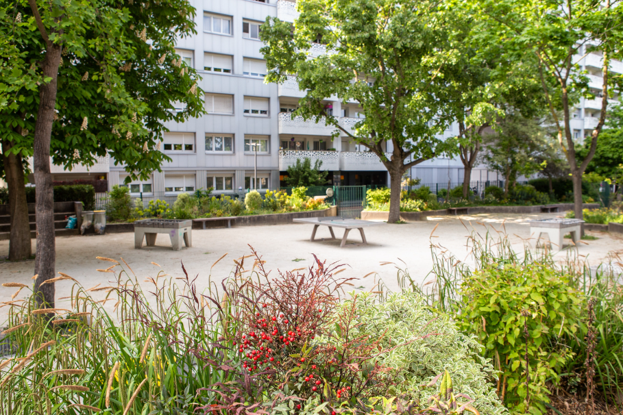Côté cour : D'un côté, les petits, en toute tranquillité, profitent de l’espace qui leur est réservé, notamment une balançoire, à l’ombre d’arbres invariablement majestueux… De l'autre côté, les plus grands peuvent jouer au ping-pong ou au baby-foot.